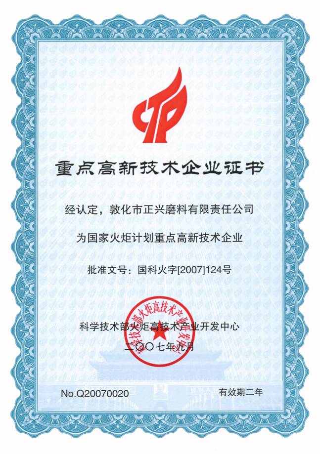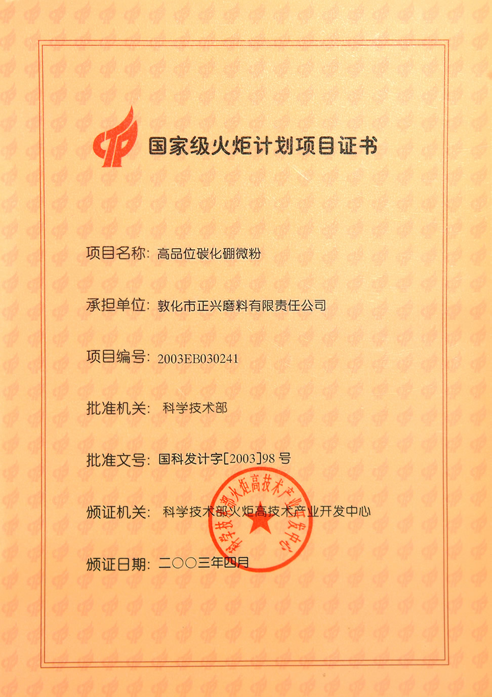 国家级火炬项目证书